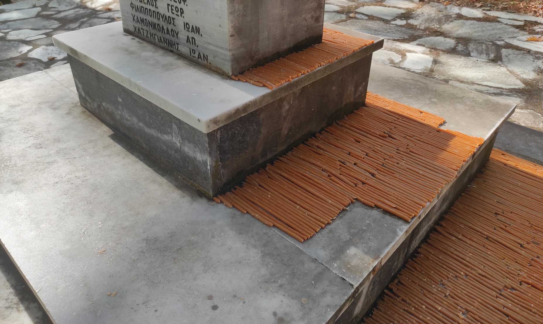 Near the Milies railway station has been erected a monument in memory of the local residents executed by German troops on Monday, October 4, 1943. The existence of such a monument, like the many others that exist throughout Greece, constitutes a kind of “official” recognition of the victims who fell during the years of the brutal occupation. Alongside this “official” tribute, however, there is also a more personal way of remembering. The names permanently engraved on marble and stone refer to people who were relatives, close friends, or even people with whom one had daily contact or simply shared companionship. Here, the “hard” and “inflexible” material is contrasted with a more ephemeral, malleable, and soft one: the candle. Used candles from nearby churches—sometimes dedicated to the memory of beloved people who have passed away, or as reminders of all kinds of wishes—are spread out on the ground, like a “shadow” of the marble column, falling at the moment of execution.